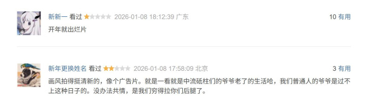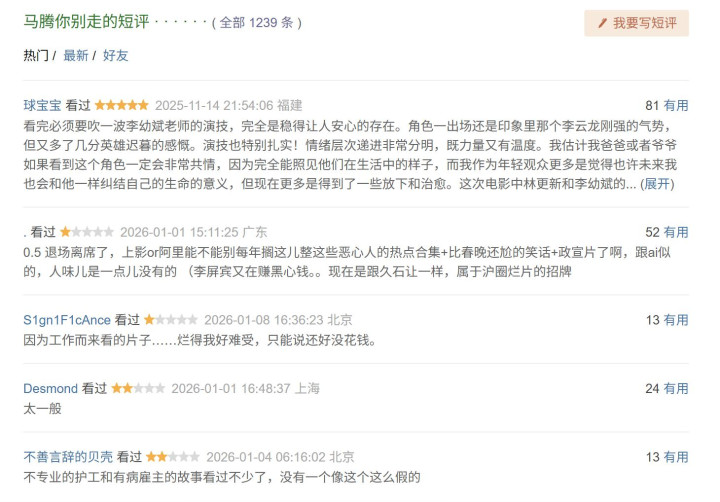 电影首页随机显示的五条评论有四条差评,有打一星的观众给出0.5分,并怒批“上影or阿里能不能别每年搁这儿整这些恶心人的热点合集+比春晚还尬的笑话+政宣片了,跟ai似的,人味儿是一点儿没有的。”另外一个一星庆幸自己没花钱“烂得我好难受。”还有一条吐槽电影虚假“不专业的护工和有病雇主的故事看过不少了,没有一个像这个这么假的。”