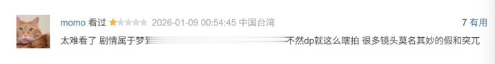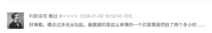 结果国内这些公司、导演和演员都是记吃不记打、只顾着挣钱不关心会不会成为笑话。2026开年,才过了一个多星期,就至少端上来四部烂片了(其他难看的欢迎评论区补充帮大家避雷!)