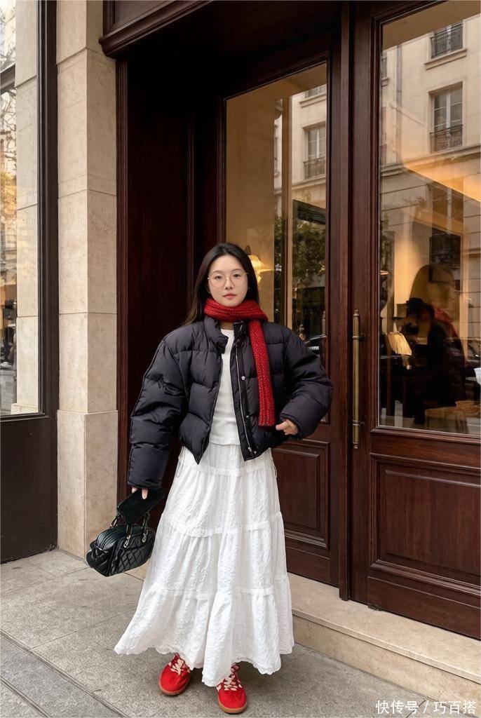 冬天穿白色半裙清冷绝艳素雅动人,搭配羽绒服美得有温度有风度,白色半裙内搭肉色打底裤,轻盈又暖和。