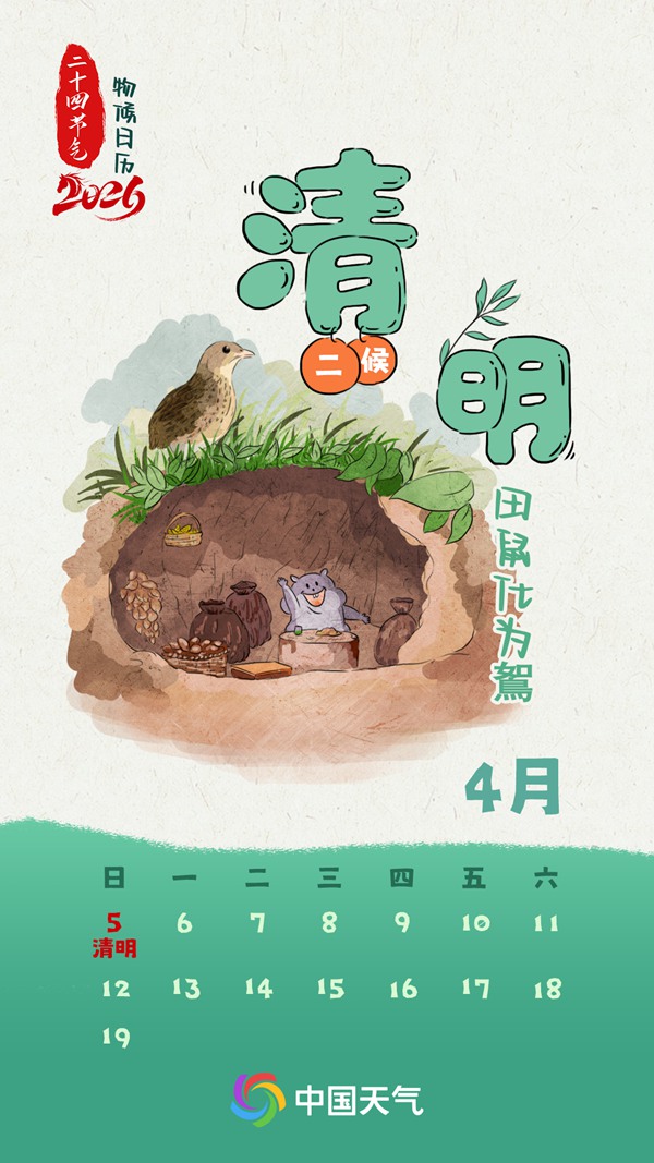 到了清明,人们发现田鼠等小动物变少了,田间地头多了鴽(rú)也就是鹌鹑之类的小鸟的身影。古人认为鼠是至阴之物,而鴽是至阳之物。“田鼠化为鴽”和惊蛰的“鹰化为鸠”一样,并非真的是田鼠变成了鹌鹑,而是随着天气逐渐暖和,食物变得充足,田鼠地面觅食活动逐渐减少,而阳性的小鸟开始在山野田间活跃,人们用化字来形象地表达阴消阳长。