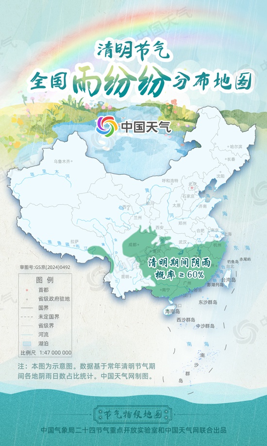 从清明节气全国雨纷纷分布地图来看,“清明时节雨纷纷”的区域主要在南方,江南、华南大部及西南地区的贵州、重庆、四川盆地等地阴雨概率都较高,其中对于华南来说,清明节气开始正是常年华南前汛期开启的时候。省会、首府、直辖市中,长沙、南昌、福州、贵阳、广州、杭州等地清明期间阴雨概率都超过60%。