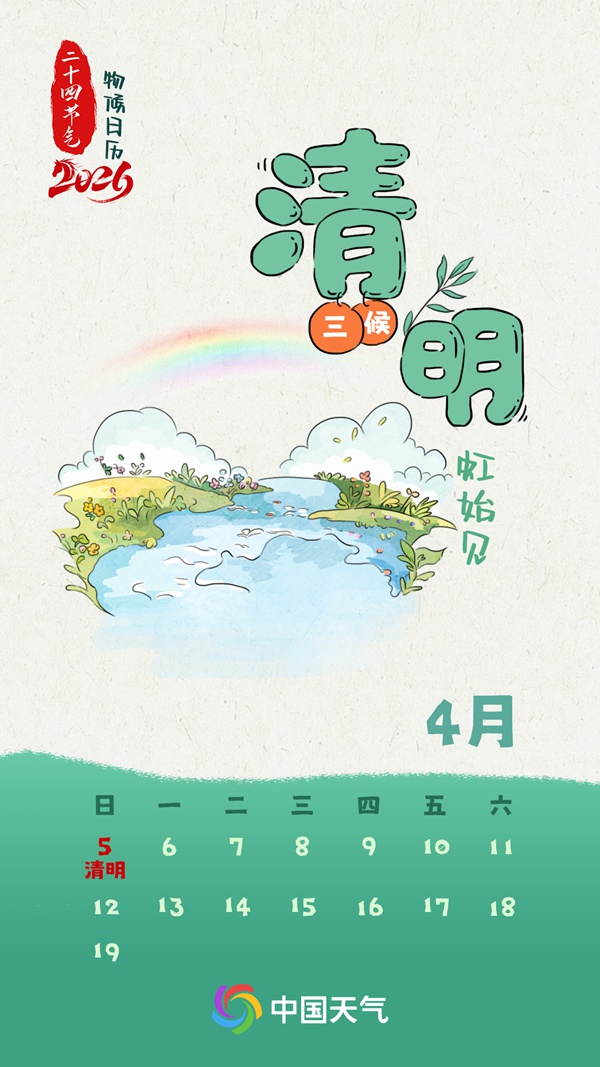 清明时节雨水渐多,而雨后初晴、阳光洒落之时,出现彩虹的概率也随之增大。古人视彩虹为祥瑞,认为虹霓之美源于阴阳消长、时序更迭过程中形成的天地平衡。此外,人们还用彩虹来预测天气,正所谓“东虹日头西虹雨”,指的是彩虹若出现在东方预示着雨停出太阳,在西方则还会落雨。